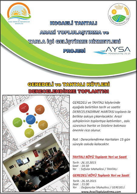Kocaeli Tahtalı AT ve TİGH Projesi kapsamında bulunan Geredeli ve Tahtalı Köyleri Derecelendirme Haritası toplantı ile birlikte 26.10.2015 tarihinde aşağıda belirtilen saat ve yerlerde askıya çıkarılacaktır.