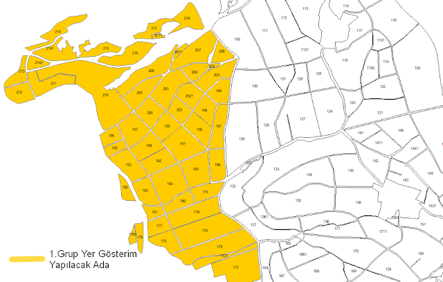 Yer gösterimleri ADA numaralarına göre aşağıdaki harita ve listede belirtilen tarihlerde arazide yapılmaktadır. Arazi sahiplerine ilanen duyurulur.