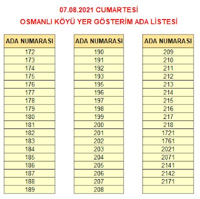 07 AĞUSTOS 2021 CUMARTESİ Günü OSMANLI MAH. Yer Gösterimi Yapılacak Ada Numara listesi ve krokisi aşağıda belirtilmiştir.